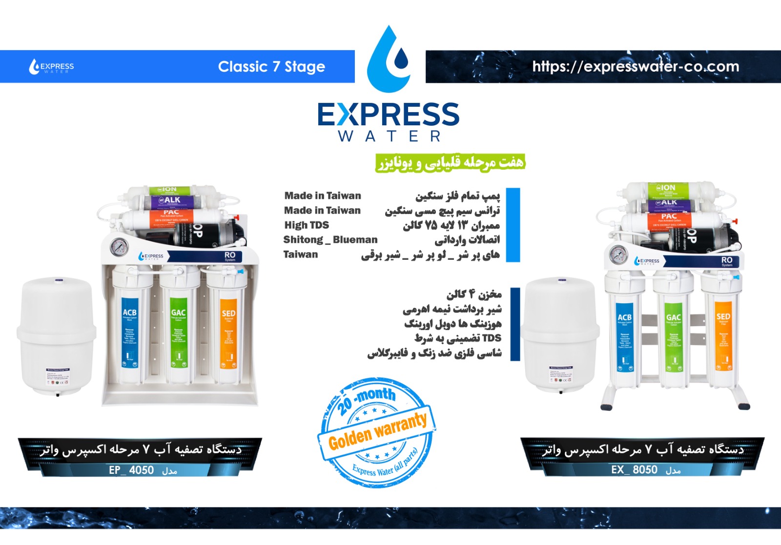 شرکت اکسپرس واتر با بیش از 19 سال سابقه درخشان در زمینه واردات _ صادرات _ مونتاژ و عرضه دستگاه های تصفیه آب خانگی در خدمت شماست.
